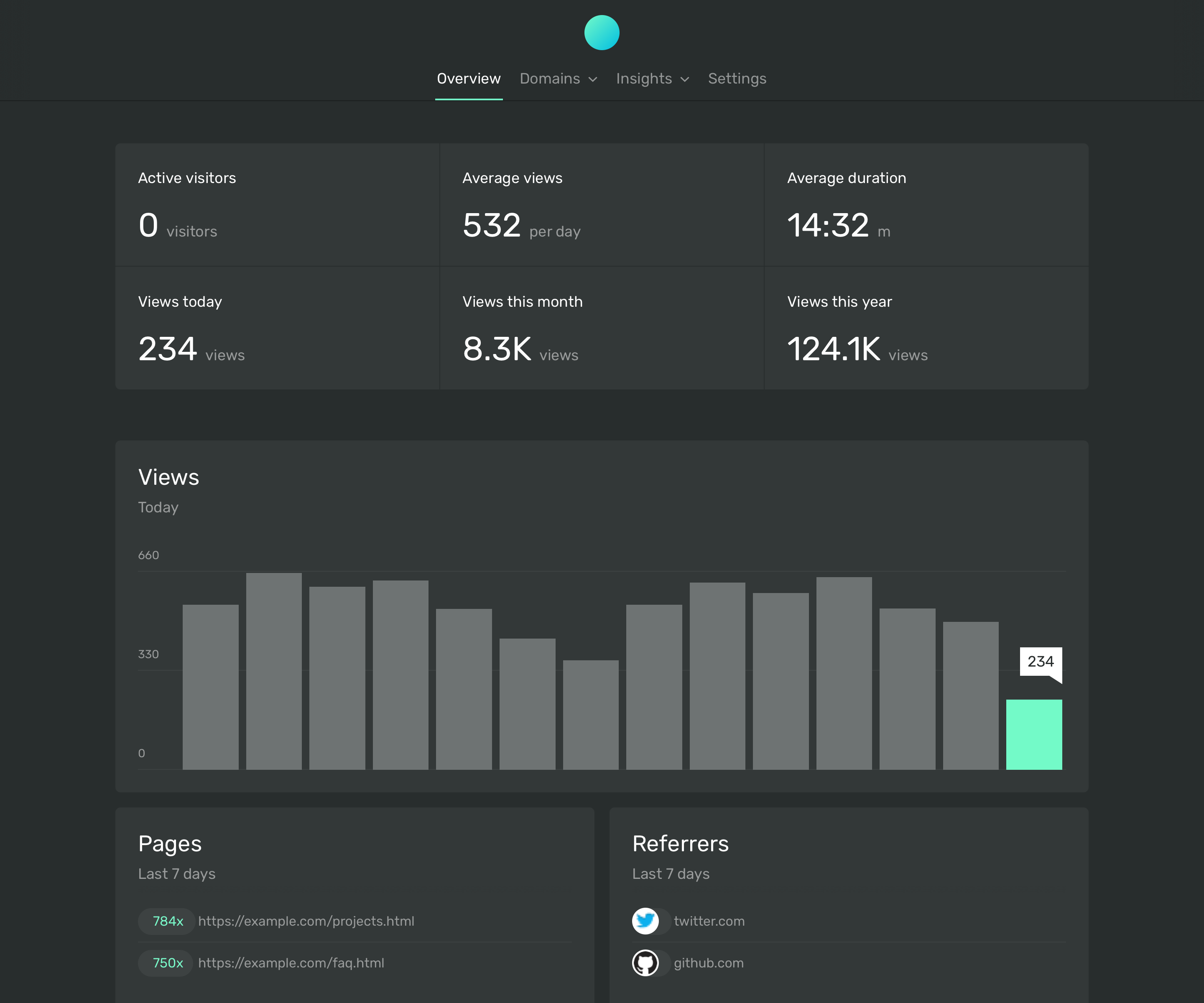 • Insights: Ackee offers insights into views, referrers, durations and more, providing all the details you need to understand your website's traffic.