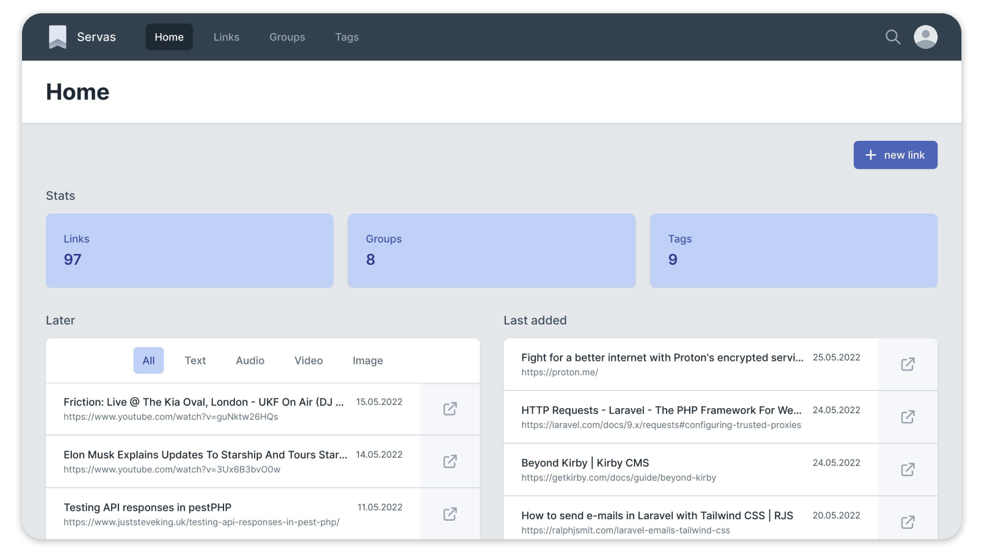 • Efficient Bookmark Management: Servas is a self-hosted bookmark management tool that allows you to efficiently organize and access your bookmarks. It provides a centralized platform where you can store all your bookmarks and retrieve them whenever needed.
